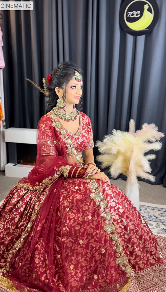 Boutique-Made Deep Maroon Bridal Lehenga Set with Heavy Zari & Sequin Embroidery
