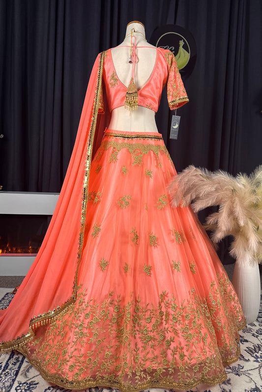 Boutique Peach Pink Embroidered Silk Lehenga Set with Gold Detailing