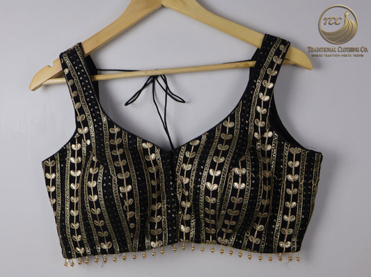 Black & Gold Embroidered Modern Blouse with Tie-Back Closure – Ideal Wear Parties, Weddings & Celebrations