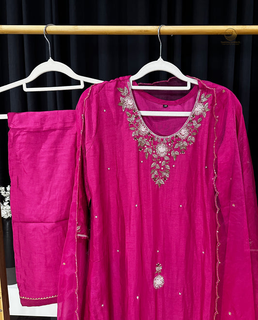 Bright Pink Handwork 3-piece Kurta Set – Floral Neckline with Dupatta | Festive & Cultural Wear
